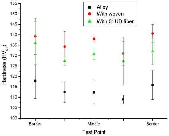 The hardness varied across the cross-section of the samples (Figure 6). In the unreinforced alloy, the hardness was ~5% higher at the edges than in the central part of the samples. In the composites, the hardness was similar in the center and at the borders, with a variation of ±1% on both sides of the center.