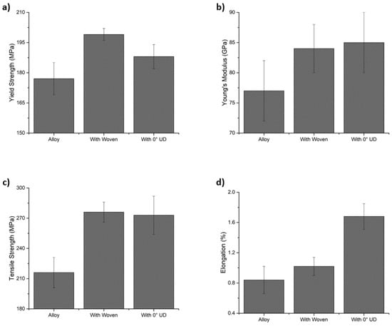 The yield strength of the composites was 199 ± 3 MPa for the woven-reinforced composite and 188 ± 6 MPa for the unidirectional reinforced. Therefore, the increase in the yield was 12% for the woven and 7% for the unidirectionally reinforced composite compared to the alloy. The tensile strength of the composites was ~275 MPa, which was 25% higher than the unreinforced. Finally, there was also an increase in the values of Young’s modulus. The values measured for the composites were ~84 GPa for the composites, while for the unreinforced alloy was 77 GPa.