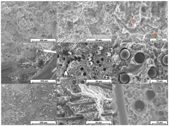 SEM fracture surfaces: (a) AA413 aluminum alloy and (b,c) magnification with dimples arrowed in orange; (d) aluminum reinforced with woven and (e,f) magnification of the extracted fibers; (g) aluminum reinforced with 0° unidirectional fiber and (h,i) magnification of different zones.
