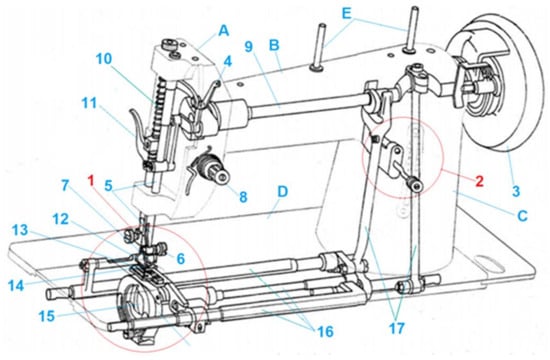 General structure and kinematic system of a lockstitch machine. (A) Sewing Head, (B) Horizontal Arm, (C) Upright Arm, (D) Machine Bed, (E) Spool Pin, (1) Stitch creation mechanism, (2) Stitch adjustment mechanism, (3) Machine pulley, (4) Thread take-up lever, (5) Needle bar, (6) Needle clam screw, (7) Needle holder (8) Needle thread tension assembly, (9) Arm shaft, (10) Pressure bar, (11) Pressure bar lifter, (12) Pressure foot, (13) Needle, (14) Feed dog, (15) Bobbin case, and (16) Loop-taker (Shuttle), (17) Driving Arm.