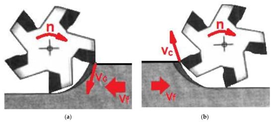 - Climb—when the cutter performs a rotary motion in accordance with the movement of the workpiece feed. The result is an even and matt machined surface, allowing the weakening of cutter wear and prolonging its durability. For milling to be effective, minimal play in the drive mechanism is necessary. It is caused by the process of plunging the individual blades of the cutting tools into the workpiece under the conditions of generating the chip from high to low thickness (Figure 2). Most of the heat generated is transferred to the chip removed behind the cutter, weakening the occurrence of the chips’ re-cutting phenomenon. The values of the selected cutting parameters are much higher compared to up-cut milling. The milling process analyzed in the present study concerns the concurrent type.
