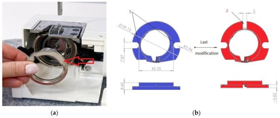 Bobbing case analyzed. (a) A view of the original bobbin case; (b) Two grooves 1 made during earlier modifications and the one groove 2 made after last modification of the bobbin case (units in mm).