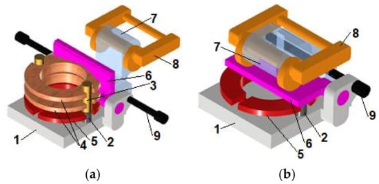 Scheme of milling chuck. (a) In open state—during supply of the bobbin case to the milling chuck; (b) In close state—directly before milling the groove in the bobbin case. 1—milling check support, 2—locating pin, 3—wire guides, 4—series of bobbin case delivered from a supply bin on the production line (not presented here), 5—machined bobbin case, 6—swivel arm, 7—lever, 8—eccentric, and 9—locking pin.