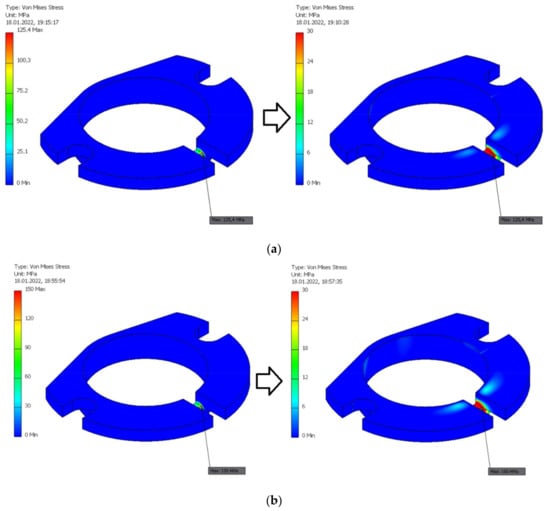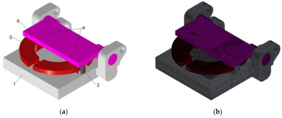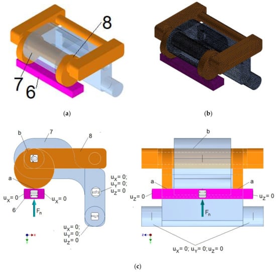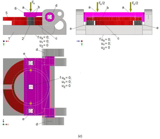 To allow a proper action of eccentric 8, the angled lever 7 was blocked in a specific position relative to the milling chuck support 1 by means of the two locking pins 9 (Figure 4b). The action of the eccentric 8 generated a force pressing the swivel arm 6 against the upper front plane of the machined bobbin case 5, and then, pressing of the bottom front plane of the bobbin case 5 against the supporting surface of the milling chuck support 1. This allowed generation of frictional forces in the contacts of the bobbin case 5 with the supporting surface of the milling chuck support 1 and with the bottom plane of the swivel arm 7. The distribution of these forces prevented the bobbin case 5 from moving during milling under the influence of the cutting forces caused by the movement coming from the cutting tool, i.e., the end mill.