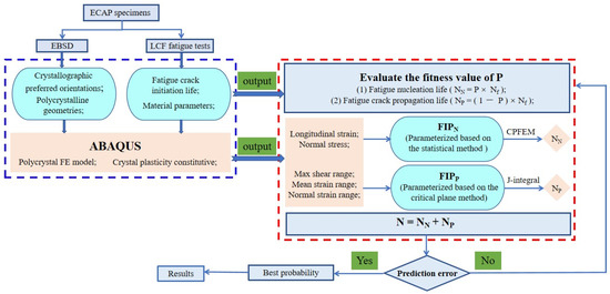 In this paper, an LCF fatigue crack initiation life approach that explicitly distinguishes between the nucleation and small crack propagation regime is proposed based on experiments and crystal plasticity modeling. Choosing the UFG 6061AA as a model material, we carried out the following studies: (1) A synthetic polycrystal finite element model with a free surface was constructed and regarded as an analytical model with which to clarify the contribution of the inhomogeneous plastic deformation to the fatigue crack initiation. (2) Though conducting CPFEM simulations, the cycles required for nucleation were assessed based on the inhomogeneity of the material. (3) By introducing the FIP related to the microscale multiaxial strain field into the cyclic J-integral, the small crack propagation rate equation was obtained by associating the cyclic J-integral with the range of crack tip opening displacement. After this, the small crack propagation life was predicted based on a newly deduced Coffin–Manson model for UFG metallic alloys. (4) Comparative studies were conducted between the methods based on only one FIP and the proposed combined approach. (5) The validation of the proposed LCF crack initiation life model was carried out with respect to the errors between the predicted results and the experimental data. Finally, a technical diagram was plotted with an algorithm of all calculation steps (shown in Figure 1).