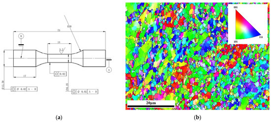 (a) Geometric dimensions of the cylindrical specimen (unit: mm); (b) EBSD map of UFG AA6061.