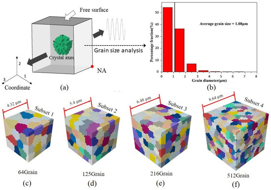 (a) Boundary condition and loading direction applied to RVE; (b) grain size analysis; (c) subset 1–64 grains; (d) subset 2–125 grains; (e) subset 3–216 grains; (f) subset 4–512 grains.