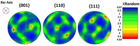 Based on the microscopic experiment of UFG 6061AA, it is acknowledged that Goss texture is formed for UFG 6061AA in the process of ECAP. In other words, the polycrystalline aggregate will show obvious anisotropy. Therefore, the number of grains in RVE should be sufficient to reflect the plasticity heterogeneities of the real microstructure. However, numerical simulations with a large number of grains under a crystal plasticity framework are very costly from a computational viewpoint. Thus, a reasonable number of grains with the reduced crystallographic texture should be used for the accurate prediction of mechanical response at the polycrystal level. In this investigation, four RVEs with the same number of elements (27,000) but containing 27, 64, 216, and 512 grains (Figure 4c–f, different colors represent different grains) were constructed by grain size analysis (as shown in Figure 4b) and assigned a reduced crystallographic texture extracted from the pole map (Figure 5). The computationally obtained results and their local enlarged drawing at the peak stress are plotted in Figure 6. The difference in macro hysteresis loop shows that the peak stress identified for 216 grains is slightly higher than that for 512 grains, but less than 2 MPa. Therefore, a 3D polycrystalline RVE established using 27,000 elements and 216 grains was adopted in the following CPFE simulations.