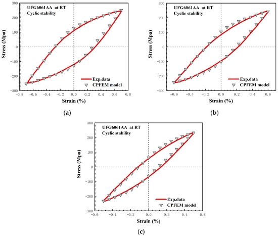 Finally, the rationality of the material parameters was verified in terms of the stable stress–strain hysteresis loops and their corresponding numerical simulation. Figure 7 shows a comparative analysis between the simulated stable stress–strain hysteresis loops and the experimental ones at the strain amplitudes of 0.5%, 0.6%, and 0.7%. The maximum stress difference between the test data and the micro-level simulations is less than 3 MPa, which indicates that the obtained simulated stable hysteresis curves are in good agreement with the experimental results. Meanwhile, all the simulated results predict a slight cyclic softening, which is consistent with the experimental observation. Moreover, in order to reflect the reduction in dislocation density observed in the cyclic loading process, two internal variables, i.e., initial dislocation density and critical shear stress, are reduced with the microstructure evolution. In summary, all the above results show that the calibrated material parameters for the crystal plasticity model are reasonable and acceptable for use in further investigations.
