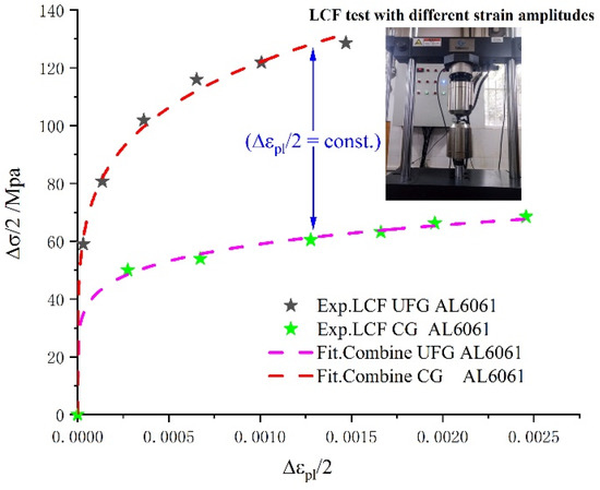 Stress amplitude versus plastic strain amplitude curves of UFG 6061AA.