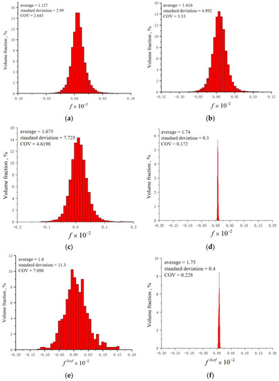 Figure 10 displays the histograms of the frequency distribution for and under various strain amplitudes. It is evident that the statistical distributions for and are Gaussian-like, similar to those reported in [11,12]. Therefore, it is reasonable to adopt these two parameters to signify the level of dispersity of the inhomogeneous local strain field. As shown in Figure 10a–c, the SD of presents a trend of growth, which implies that the inhomogeneity of the material increases with the increase in the applied strain amplitude. Figure 10c,d compare the SD of for the whole RVE at an amplitude of 0.7%, and it is found that the SD of at the 300th cycle is 20 times larger than that at the 3rd cycle. Furthermore, Figure 10e,f investigate the inhomogeneity on the free surface of the RVE by calculating the at the 300th and 3rd cycle with respect to the strain amplitude of 0.7%. A very similar evolution was found but with a 28.25 times difference. When comparing Figure 10c,d with e,f, the SD of is obviously higher than that of in the 300th and 3rd cycle. Based on the analysis above, we can conclude the following: (1) The cycle numbers and the applied loading conditions are the two key external factors that affect the inhomogeneity of materials. (2) Even if there is no damage on the surface, the metal surface suffers from more inhomogeneous plastic deformation than the interior of the material, which further clarifies the contribution of the plasticity heterogeneities and micromechanical interactions between neighbor grains to the fatigue damage mechanism. (3) The SD of calculated with respect to the free surface layer of the RVE is more suitable for use as a fatigue criterion to judge the fatigue nucleation occurrence.