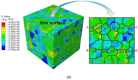 The loading direction applied to the polycrystalline finite element model is shown in Figure 4a. Additionally, the specific boundary conditions can be implemented using the following steps: (1) Normal displacement was applied with U3 = U for the positive surface of the third axis, while U3 = 0 was applied for the negative surface of the third axis. (2) On the negative surface of axes 1 and 2, the displacement in the normal direction of all nodes was equal to zero. (3) For the positive surface of the first axis, node A at the lower right corner of the surface was taken as the reference point, while the other nodes on the surface were recorded as A′ set. In order to meet the condition of macro-uniaxial loading and continuous material deformation, the constraint Equation (25) was embedded into ABAQUS to satisfy the boundary conditions above.