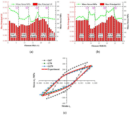In order to further validate the aforementioned deduction, two soft grains and one hard grain were selected to explore the microscale cyclic plastic response at the grain level. Figure 12c shows the mechanical responses of individual grains obtained from soft grains 67 and 70 and hard grain 169 with respect to the 10th cycle. It can be seen clearly that the two soft grains exhibit a higher strain response and a lower stress peak as compared to the hysteresis loops obtained from the experiment, while the hard grain exhibits a higher stress response and a lower strain response. These results further demonstrate that the material properties of hard grains and soft grains are anisotropic in terms of elastic and plastic deformation, which are, respectively, linked to elastic lattice distortion and the plastic slip accumulated over the course of cyclic loading. Moreover, one can see that the yield strength, Young’s modulus, and cyclic response for the soft grains are smaller than those obtained from the experiments, which is in contrast to the situation seen in hard grains. These well-oriented grains, which are prone to slip, will contribute to a larger accumulation of micro-level plastic deformation and higher hysteresis energy dissipation.