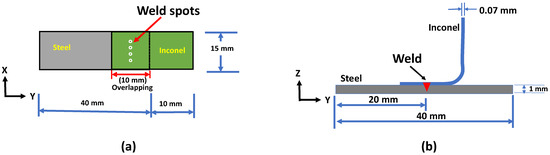 Many industrial applications use thin foils to cover parts or components which are exposed to elevated temperature or corrosive environments. This helps to protect the parts/components and increases the functional performance with a substantially longer life span [1,2,3]. Therefore, the use of microtechnology has increased over the last few years where micro-welding has gained significant importance for fabricating components with thin foils. It also demonstrates the high demand for various industrial applications including battery interconnect welding, micro-turbine fabrication and micro-electronics [4,5,6,7]. This micro-welding demands an efficient joining method which can address the joining challenges associated with ultra-thin foil welding, such as, overheating, distortion, warping and good part fit-up [8,9]. Therefore, attention is needed to precisely control heat input during the micro-welding process. One of such widely used micro-welding processes is micro-resistance spot welding (micro-RSW) which is a well-known joining technique for many industrial applications including thin foil joining due to low equipment cost, good quality control/process monitoring and low process variation [10,11]. However, micro-RSW is not free of challenges or issues. The main challenges associated with micro-RSW are surface cleaning of contaminants (i.e., grease, oil and dirt), RSW-electrode sticking with the parent materials, picking up the residue from the joint location and additional processes to maintain the original electrode shape (i.e., RSW electrode tip dressing) [12,13]. In addition, being a contact/touch-based joining process, micro-RSW is also a slow process, and obtaining a bigger nugget is difficult as it is limited by the RSW electrode size, parent material thickness and composition. In contrast, micro-laser spot welding offers several advantages over the micro-RSW process including non-contact joining, single-sided access, up to five times faster placement of spots, easy automation and flexibility in nugget size [14,15]. However, there are challenges associated with micro-laser welding as well, especially for joining ultra-thin sheets to thick sheets, such as (i) ensuring intimate contact between the mating surfaces [16], (ii) controlling heat input to avoid cutting through the thin upper sheet [17] and (iii) proper selection of laser welding parameters to control welding defects such as cracks, porosity or under-weld/no-weld conditions [18,19,20].