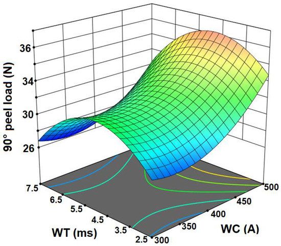 The RSM design matrix and the measured values of average 90° peel peak load (PL) with standard deviation (SD) are given in Table 3. In Table 3, the process parameters were chosen as per central composite face-cantered design including four center points using RSM design (a second-order model can be developed efficiently) to analyze the response of interest based on the results. A second-order model can provide a better/efficient optimum value as well as interaction effect of process parameters compared to the linear model. The maximum and minimum PLs were obtained from sample no. 11 (i.e., 39.16 N) and sample no. 8 (i.e., 26.12 N), respectively. The maximum PL was obtained for the higher value of WC and the middle value of WT. Figure 2 shows 3D response surface and contour plots for the effect of process parameters on response which were constructed according to the fitted quadratic model. It is observed from Figure 2 that an increase in the weld time, up to some certain value, increases the PL. Further increase in the weld time reduced the PL observed. When the weld time was very low, incomplete penetration occurred. At longer weld times, excess melting of material was observed (burn-through of top sheet) with a consequent reduction in PL. Figure 2 also indicates that the PL increased with an increase in the value of weld current. Increasing the weld current increases the heat generation at the faying surface resulting in a large amount of the base metal being melted, consequently forming a weld with deeper penetration depth. It can also be concluded from Figure 2 that the maximum value of PL was obtained at the higher value of weld current and middle value of weld time. Similarly, the minimum value of PL was obtained within the range of lower and middle values of WC and the lower value of WT.