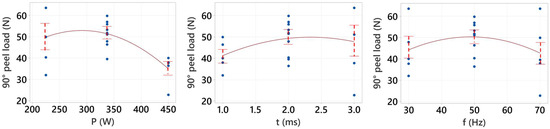 The measured peak load (PL) responses obtained from the laser-welded 90° peel samples are listed in Table 4. In Table 4, the process parameters were chosen as per central composite face-cantered design including five center points using RSM design (a second-order model can be developed efficiently) to analyze the response of interest based on the results. A second-order model can provide a better/efficient optimum value as well as an interaction effect of process parameters compared to the linear model. The maximum and minimum PLs were observed for sample no. 20 (at P = 225 W, t = 3 ms and f = 30 Hz) and sample no. 14 (at P = 450 W, t = 3 ms and f = 70 Hz), respectively. Figure 3 shows the mean effect plot for the mean of 90° peel peak load which includes data point locations in blue color, mean plots and associated standard deviations. From Figure 3, it was found that the laser power has the most significant effect on the PL followed by pulse on time and pulse frequency. This is because the variation in the value of PL was maximum with the increase in laser power whilst minimum in the case of pulse frequency. It is apparent from the figure that PL increases with power and pulse frequency up to a threshold value and thereafter it starts decreasing. An initial increase in laser power and pulse frequency created a larger melt pool which elevated the quality of the weld from under-weld to good-weld; however, a further increase in laser power and pulse frequency created an undercut or underfill leading to an over-weld condition and subsequently reducing the PL [4,19,39]. Kumar et al. [37] achieved a similar trend of joint strength profile with laser power for the laser-welded 0.4 mm Al to 1.5 mm Al. In addition, PL increased continuously with the pulse on time; the underfilling of the top sheet material might not be reached within the limiting value of pulse on time. Consequently, the PL value is constantly increasing with the pulse on time.