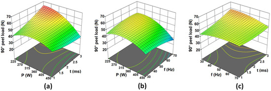 The 3D response surface and contour plots were constructed according to the fitted quadratic model as shown in Figure 4. Figure 4 shows the interaction plots for PL with one variable kept constant at their respective centre value and the other two within the working range. In terms of an interaction between the laser power and pulse on time, as shown in Figure 4a, the PL is maximum at lower values of laser power and higher values of pulse on time. This might be due to the lower power and higher pulse on time providing optimum weld profile between the sheets. It is evident from Figure 4b that PL increases with increasing pulse frequency at low power whilst decreasing at high laser power. This is because, at low power and low frequency, lower energy density is generated, resulting in a lack of penetration and thus a weak joint. Further, with a low value of laser power and pulse frequency towards the maximum value, the PL is improved as energy density increases and maximum strength is obtained. Meanwhile, at a high value of laser power and high pulse frequency, the depth of penetration is larger due to the higher rate of increase in specific point energy causing underfilling (overheating) and resulting in low joint strength [39]. From Figure 4c, it can be seen that by increasing the pulse frequency from 30 Hz to 70 Hz, PL increases for the low value of pulse on time whilst decreasing at high pulse on time. The maximum and minimum values of PL can also be observed from the 3D surface plots. It can be concluded from Figure 4a that the maximum values of PL can be achieved around the highest level of pulse on time (3 ms) and the lowest level of laser power (225 W). The exact values of the optimized process parameters to achieve maximum and reproducible PL are determined in Section 3.3. Maximum PL can therefore be achieved using the laser welding process (63.60 N) rather than the resistance spot welding process (39.16 N). As the main objective of this paper is to replace the existing micro-RSW process with flexible laser welding, optimization was conducted for the laser welding process.