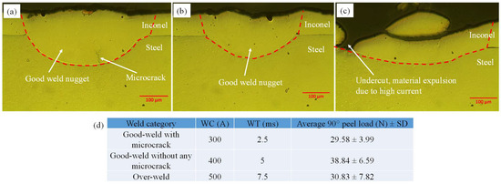 The weld interface of micro-RSW welds was studied with the help of optical micrographs, and it was found that within the selected input range of micro-RSW parameters (as indicated in Table 3), only two types of welds were observed, namely good welds and over-welds (Figure 5). Good welds could be categorised as good welds with a microcrack and good welds without a microcrack. A good weld with a microcrack appeared at WC = 300 A and WT = 2.5 ms (see Figure 5a). At WC = 400 A and WT = 5 ms, a good weld without a microcrack was observed (Figure 5b). It is evident from the micrographs that both the depth of penetration and interface width were high for the good weld. As a result, the T-peel load of the good weld without a microcrack was high (38.84 N) as indicated in Table 3. The appearance of the microcrack reduced the T-peel load to 29.58 N in good-weld joints as indicated in Table 3. The over-weld condition was prominent when WC = 500 A and WT = 7.5 ms were used. Undercut and material expulsion due to high current were the main attributes in micro-RSW over-weld joints (Figure 5c). As a result, the T-peel load was reduced (30.83 N) as the failure occurred at the location of the undercut in the over-weld.