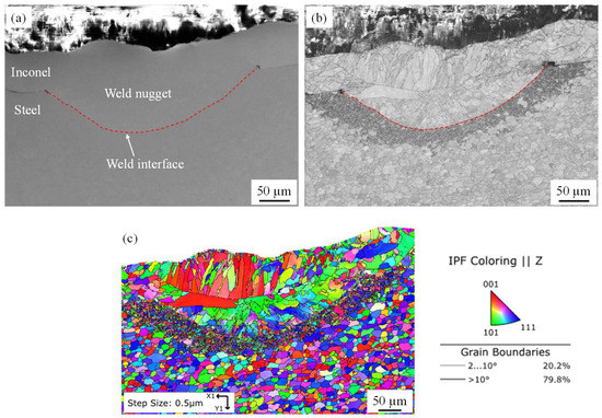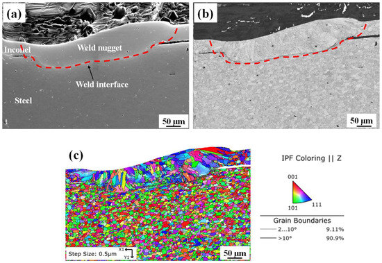 The weld microstructure of the micro-RSW welded joint was further studied by carrying out a SEM and EBSD analysis of the good weld without any microcracks condition. Figure 6a shows the SEM micrograph at the joint interface. There was no microcrack or void observed at the weld interface and at the weld zone. The band contrast image (Figure 6b) indicates that the interface is not prominent between the weld nugget on the Inconel side and steel base metal and there is a separate subgrain region between the weld nugget and steel base metal. The EBSD map shows that the average grain sizes of Inconel base metal, weld nugget, subgrain region and steel base metal are 10 µm, 18 µm, 2 µm and 9 µm, respectively (Figure 6c). The grains at the weld nugget were elongated from the weld interface to the middle of the weld nugget and again from the middle of the weld nugget to the top surface of the weld nugget. As there was a distinct subgrain region at the weld interface, the heat-affected zone in micro-RSW welding was large. The number of low-angle grain boundaries (LAGBs) as shown by the grey line (2° < grain boundary < 10°) is higher (20.2%) in micro-RSW good welds without any microcracks (Figure 6c). On the other hand, the number of high-angle grain boundaries (HAGBs) as shown by the black line (grain boundary > 10°) is comparatively lower (79.89%) in micro-RSW good welds without any microcracks (Figure 6c). As the HAGB provides greater hindrance to dislocation gliding, higher weld strength was achieved for the higher number of HAGBs [40].