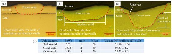 The weld interface was studied with the help of optical micrographs to understand the joint morphology. In the selected input range of laser welding parameters as indicated in Table 4, three types of welds were observed, namely under-welds, good welds and over-welds (Figure 7). An under-weld appeared at P = 225 W, t = 1 ms and f = 30 Hz. It is shown in the under-weld micrograph that the depth of penetration and interface width were very low (Figure 7a) which reduced the T-peel load (31.98 N) as indicated in Table 4. At P = 337.5 W, t = 2 ms and f = 50 Hz, a good weld was observed. Good penetration depth and interface width were the main attributes of this type of joint (Figure 7b). As a result, the measured T-peel load in the good-weld condition was high (59.83 N) as shown in Table 4. An over-weld was observed at P = 450 W, t = 3 ms and f = 70 Hz. In the over-weld, the depth of penetration was high, but an undercut appeared on the top sheet (Figure 7c). Thus, the T-peel load was considerably reduced (22.73 N) as the failure happened at the location of the undercut in over-weld conditions.