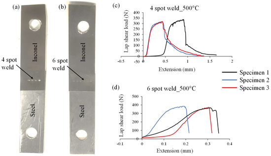 Laser weld with (a) 4 spots and (b) 6 spots. Load vs. extension plot of lap shear test at 500 °C temperature for (c) 4-spot and (d) 6-spot laser welds.