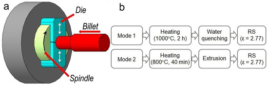 The Cu-0.5%Cr-0.08%Zr alloy was the studied material in this work. Cu-5%Cr and Cu-10%Zr master alloys, which were prepared from high-purity metals Cu (99.96%), Cr (99.95%) and Zr (99.8%) (hereinafter, wt.%) were melted for the preparation of low-alloyed zirconium bronze. The master alloys were melted in an arc vacuum furnace in an atmosphere of purified argon on a water-cooled copper tray using a non-consumable tungsten electrode. The Cu-Cr-Zr alloy was melted in a vacuum induction furnace in an argon atmosphere in a corundum crucible. The casting was also performed in an argon atmosphere into a graphite mold with a diameter of 50 mm and a height of 120 mm. The alloy was additionally heated in a furnace at 800 °C (~40 min) before extrusion, while the pressing container was heated up to 400 °C. The final billet with a diameter of 25 mm was turned to a diameter of 20 mm, required for subsequent deformation processing. The content of chromium and zirconium in the prepared alloy was 0.5 and 0.08%, respectively, according to chemical analysis. The billets were annealed after extrusion at 1000 °C for 2 h with subsequent water quenching. Rotary swaging was carried out on a rotary swaging machine RKM 2129.02 (maximum force 8 kN) at room temperature (for details see [21]). RS was carried out for the alloy in two initial states: after extrusion at 800 °C, and after quenching at 1000 °C (2 h, water cooling). Total accumulated deformation degree (ε = ln(A0/Af), where A0 and Af are the initial and the final cross-section areas of the billets, respectively) was 2.77. The scheme of the RS process and the technological modes of processing the alloy are shown in Figure 1.