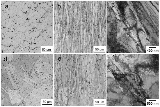 Rotary swaging of the Cu-0.5%Cr-0.08%Zr alloy leads to a significant microstructure refinement, both for the initially extruded and initially quenched states. The formation of an elongated shape along the swaging direction structure with a width of elongated grains of ~5–10 µm is observed for both states of the alloy (Figure 2b,e). In both cases, the formation of a grain–subgrain structure is observed inside the elongated grains, characterized by a high density of dislocations, which is 4 × 1014 m−2 and 5–6 × 1014 m−2 for the initially quenched and extruded alloy, respectively. The boundaries of the subgrains are formed by wide dislocation walls. The structure contains both elongated grains and shear bands and almost equiaxed subgrains. The formation of structural elements with a size of ~300–400 nm and shear bands with a width of 500–600 nm was revealed in the initially quenched alloy after RS (Figure 2f). The formation of subgrains with a size of ~200 nm and shear bands with a width of 300–400 nm was observed in the case of an alloy swaged after extrusion (Figure 2c).