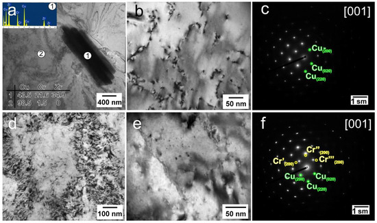 Fine structure of the Cu-0.5%Cr-0.08%Zr alloy in various states ((a) extrusion + RS; (b) extrusion + quenching + RS; (c) SAED pattern with [001] zone axis for alloy after extrusion + quenching + RS; (d,e) extrusion + RS, (f) SAED pattern with [001] zone axis for alloy after extrusion + RS).