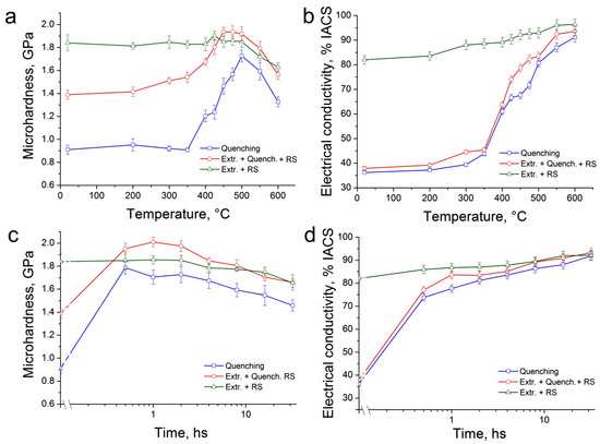 The dependences of microhardness and electrical conductivity on aging time are shown in Figure 4c,d. The study showed that a significant increase in microhardness is observed already after half an hour of heating at 500 °C for the alloy quenched and RS-treated after quenching. In the case of a quenched alloy, a further increase in the heating time to 2 hours leads to a small (within the error) decrease in microhardness. A further increase in heating time leads to a gradual decrease in microhardness. The microhardness peak is observed after heating for 1 hour and changes slightly after 2 hours of heating for the initially quenched deformed alloy. Further heating leads to a sharp softening of the alloy. In this case, heating the alloy after extrusion and RS does not lead to a change in its microhardness after 2 hours of aging. Further annealing in the range of 2–32 hours leads to a slow reduction in microhardness. At the same time, an increase in electrical conductivity is observed for the alloy in all microstructural states (Figure 4d). However, the increase in electrical conductivity is most pronounced for a quenched alloy (quenched alloy and alloy after mode 1 (Figure 1b)), since in this case it is associated not only with the annihilation of defects in the crystal structure but, first of all, with the decomposition of SSSS. In the case of an alloy swaged after extrusion, the increase in electrical conductivity is due only to the annihilation of defects in the crystal structure. Based on the results of the study of the aging kinetics, the aging parameters of the alloys were selected, of which the optimal combinations of microhardness and electrical conductivity were obtained. Heating at 500 °C for 2 hours was chosen as the optimal aging parameters for all microstructural states of the alloy, since at this temperature, the optimal combination of the main parameters is achieved. These aging parameters provide a sufficiently high level of microhardness and electrical conductivity of the alloy. The specific electrical conductivities after aging at 500 °C for 2 hours were 81.2 ± 1.6, 83.4 ± 1.8 and 87.0 ± 1.8% IACS for the alloy after quenching, quenching + RS as well as extrusion + RS, respectively.