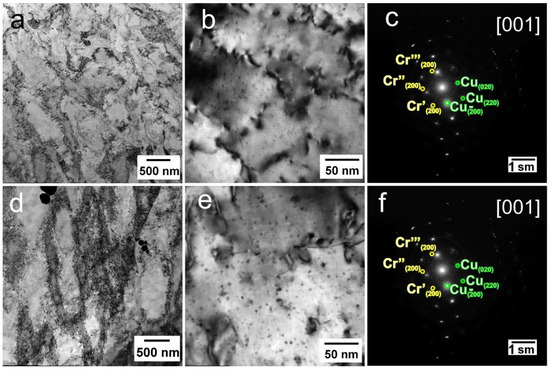 Microstructure of the Cu-0.5%Cr-0.08%Zr alloy after RS and subsequent aging: (a,b) extrusion + quenching + RS + aging at 500 °C for 2 h and (c) the diffraction pattern from the image obtained; (d,e) extrusion + RS + aging at 500 °C for 2 h and (f) the diffraction pattern from the image obtained.