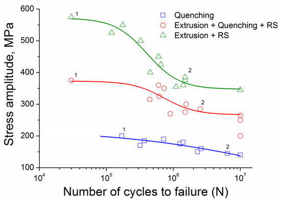 Products made of low-alloy copper alloys, for example, resistance welding electrodes, operate under cyclic loads. Therefore, the cyclic strength of these materials is also one of their most important functional properties. Cyclic strength was investigated by plotting the fatigue curves of the alloy in various microstructural states in this work. The results of studying the fatigue strength of the Cu-0.5%Cr-0.08%Zr alloy before and after RS are shown in Figure 6.