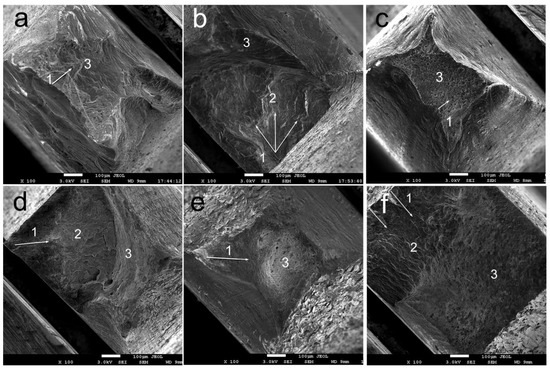 Figure 7 shows the results of a study of fracture surface fractography after fatigue testing. The studies were carried out for samples that failed in the region of the least number of cycles to failure (point 1 on the Woehler (S-N) curve) and in the region of the largest number of cycles to failure (point 2 on the Woehler (S-N) curve). For samples at point 1, the fracture is characterized by a typical ductile dimple fracture mechanism in all states of the alloy. The zone of initiation and growth of a fatigue crack is weakly expressed. Rapid crack propagation is observed. Pits with a size of about 3–10 µm have an oval shape elongated in the direction of crack growth (Figure 7a,c,d). The type of destruction changes for samples that failed in the area of point 2. Three zones can be distinguished on the fracture surface: the zone of slow initial (threshold) crack propagation (1), the zone of stable crack growth (2) and the static final break zone (3). A rather flat granular relief of the fracture surface characterize the zone of initial crack propagation (1). At the same time, the size of this zone for the quenched alloy is noticeably smaller compared to the deformed alloy, apparently due to the coarse-grained structure. The formation of a distinct corrugated relief with grooves lying across the direction of crack growth is noted in the zone of stable crack growth (2). It should also be noted that the direction of propagation of a fatigue crack in the case of a quenched alloy characterized by a coarse-grained state is different for different grains, as evidenced by the different direction of fatigue grooves (Figure 7b). The relief of the surface of fractures of RS-treated samples differs from the surface relief of quenched samples. The fracture is characterized by greater toughness in the case of the deformed state, probably due to the finer grain. At the same time, it is important to note that delamination and chips are observed on the fracture surface of the alloy samples after quenching and RS, which may indicate the presence of microcracks formed during the RS of the quenched alloy (Figure 7d). The relief of the fracture surface is the most ductile in the case of alloy samples after extrusion and RS, probably due to the presence of particles of the chromium and zirconium phases. It should also be noted that the high strength of the alloy after RS can be the reason for the absence of the stage of accelerated crack development. The final (static) fracture of the sample occurs the moment when the crack reaches the critical length at the stage of its stable growth.