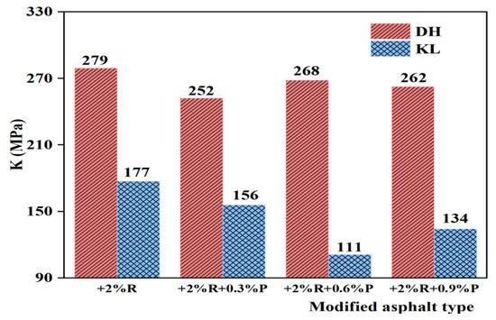 It can be seen from Figure 8 and Figure 9 that K indexes of PPA-modified asphalt and PPA/SBR-modified asphalt are smaller than those of neat asphalt or SBR-modified asphalt, indicating that PPA can improve the low-temperature performance of asphalt. For PPA-modified asphalt, the K index of DH-PPA-modified asphalt decreases as the PPA dosage increases. At the PPA dosages of 0.9% and 1.2%, the K index is similar, and the corresponding modified asphalt has better low-temperature performance. The K index of KL-PPA-modified asphalt first decreases and then increases, with a recommended PPA dosage of 0.6%, indicating that the recommended PPA dosage is related to the type of neat asphalt. For PPA/SBR-modified asphalt, the K index decreases first and then increases with the increasing PPA dosage, and the lowest point appears. Therefore, the recommended dosage of PPA for DH-PPA/SBR-modified asphalt is 0.3%, and that of KL-PPA/SBR-modified asphalt is 0.6%.