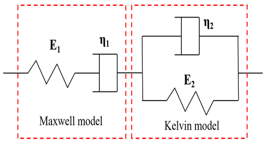 The composition of asphalt is complex, with viscosity and elasticity. Therefore, the Burgers model is often used to describe the mechanical behavior of asphalt to study its rheological properties. By fitting the Burgers model to the whole process of the asphalt BBR test, the low-temperature creep performance of asphalt can be reflected [29]. The Burgers model combines the advantages of both Maxwell and Kelvin models, and the four-parameter model can be obtained by connecting the two models in series, as shown in Figure 10.