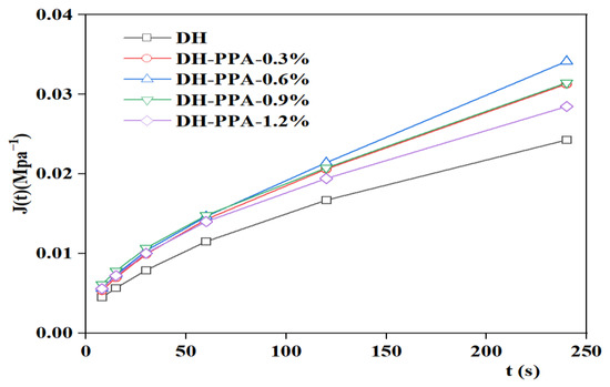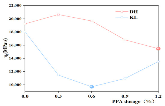 The creep flexibility curve was fitted using the 1stopt nonlinear curve fitting function to derive the four parameters (E1, E2, η1, η2) of the Burgers model, and the J(t) values were calculated. The variation of DH and DH-PPA/SBR asphalts is illustrated in Figure 11. It has been found that the viscous flow parameter η1 can be used to characterize the low-temperature deformation capacity of asphalt, with a smaller η1 indicating a better low-temperature crack resistance of asphalt [30]. Therefore, the viscous flow parameter η1 was used as an evaluation indicator to plot the variation of viscous parameters with different PPA dosages (Figure 12 and Figure 13). The analysis of η1 variation shows that the recommended PPA dosage is 1.2% for DH-PPA-modified asphalt, 0.6% for KL-PPA-modified asphalt, 0.3% for DH-PPA/SBR-modified asphalt, and 0.6% for KL-PPA/SBR-modified asphalt.