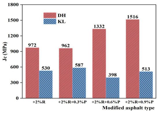 Figure 14 and Figure 15 show the Jc of PPA-modified asphalt and PPA/SBR-modified asphalt. It can be seen that the Jc of different asphalt types varies with PPA dosages. In the PPA-modified asphalt, Jc decreases with increasing PPA dosages, indicating that PPA can improve the low-temperature performance of asphalt. After adding PPA to SBR-modified asphalt, Jc of DH asphalt increases, and Jc of KL asphalt decreases and then increases, indicating that the low-temperature performance of SBR-modified asphalt is adversely affected. Because of the addition of PPA, part of the oil with a small molecular weight in the neat asphalt is absorbed. With the increase of PPA dosages, small molecules decrease, the polarity between molecules increases, the motility of large molecules decreases, the asphalt relaxation ability decreases, and the low-temperature crack resistance decreases. The low-temperature performance of PPA-modified asphalt and PPA/SBR-modified asphalt with different dosages was compared and analyzed using Jc. The recommended dosage of PPA is consistent with the results obtained using η1.