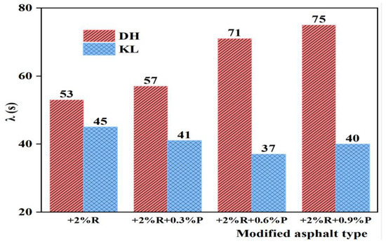 It can be seen from Figure 16 and Figure 17 that for KL neat asphalt, the λ of PPA-modified asphalt and PPA/SBR-modified asphalt is smaller than that of neat asphalt. With the increase of PPA dosages, the λ first decreases and then increases, indicating that the addition of PPA improves both viscosity and elasticity of asphalt. The minimum λ is achieved at a PPA dosage of 0.6%. For DH neat asphalt, the λ of PPA-modified asphalt and PPA/SBR-modified asphalt shows an increasing trend, indicating that the addition of PPA reduces the relaxation rate of asphalt, which is not conducive to asphalt stress dissipation. By analyzing the relationship between the low-temperature performance and relaxation time, the obtained recommended PPA dosages for PPA-modified asphalt and PPA/SBR-modified asphalt are consistent with those obtained using η1 and Jc.