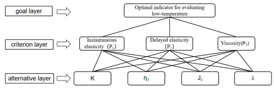 To evaluate the low-temperature performance of PPA-modified asphalt, the four indicators (K, η1, Jc, and λ) were compared and analyzed in terms of instantaneous elasticity, delayed elasticity, and viscosity. In addition, AHP is a comprehensive evaluation method used to solve evaluation problems created by an American operations researcher Saaty [32]. It was used for quantitative analysis to determine the optimal evaluation indicators. The analysis process is shown in Figure 18.
