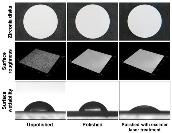 Surface roughness and surface wettability of zirconia disks. Macroscopically, there was no difference in the surface properties of the zirconia discs. In a 3D measuring laser microscope, the surface texture was smoother in the polished disks compared to the unpolished disks, but there was no difference in surface texture between the polished disks with or without the excimer laser treatment. There was no difference in surface wettability between the unpolished and polished disks, but the polished disks with the excimer laser treatment had an improved surface wettability compared to the polished disks without the excimer laser treatment.