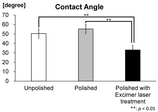 Contact angle of zirconia disks. The contact angle of polished disks irradiated with the excimer laser was significantly lower than the unpolished disks and polished disks. (n = 5).