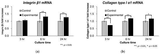 mRNA expression levels of Integrin β1 and Collagen type I α1. (a) The mRNA expression level of integrin β1 was significantly higher in the experimental group compared to the control group at 6 and 24 h. (n = 5) (b) The mRNA expression level of collagen type I α1 was significantly higher in the experimental group compared to the control group at 6 and 24 h. (n = 5).