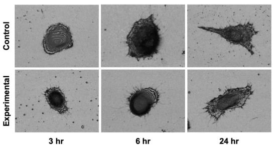 3D measurement laser microscopy observations revealed the cell morphology and elongated microspike formation in L929 fibroblasts (Figure 5). There was no clear difference in cell morphology at 3, 6 and 24 h. However, at 3 h, elongated microspike formation was observed predominantly in the experimental group compared to the control group. After that, the microspikes tended to elongate with time. Microspike formation was also observed in the control group at 6 and 24 h as in the experimental group.