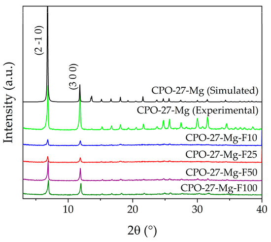The characterization of all materials started with verifying their crystalline nature using powder X-ray diffraction (PXRD). Figure 1 shows the diffraction patterns obtained compared with the simulated powder pattern of CPO-27-Mg. As can be seen, in all cases, CPO-27-Mg was obtained as the only crystalline phase without impurities or secondary phases, which can be evidenced by the agreement with the reflections of the simulated powder pattern and the absence of additional reflections. Additionally, the functionalized samples show a decrease in crystallinity due to the post-synthesis impregnation treatments. In this series, the presence of the two main reflections stands out, i.e., those located at 6.9° and 11.9° of 2θ, corresponding to the crystallographic planes (2 1 0) and (3 0 0), respectively. As expected, the treatment decreased the crystallinity of the MOF, and this fact could be analyzed by determining the average crystallite size (Dp) through the Scherrer equation (Equation (1)) [31]: