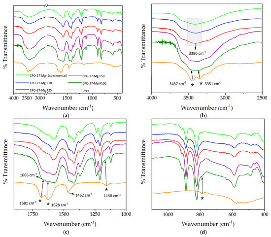 The study of urea incorporation in the MOF began with a qualitative analysis by FTIR spectroscopy focused on the spectral zones, giving more information about the functional groups of the urea molecule. In agreement with previous works, CPO-27-Mg shows the characteristic bands of this material [22,24]. On the other hand, the urea bands were assigned based on data reported in the literature [32,33]. As shown in Figure 2, the broad band between 3500–3300 cm−1, corresponding to the vibrational stretching (νas and νs) of the O-H groups of the hydration water molecules, is centered at ca. 3380 cm−1 for the bare CPO-27-Mg. In some of the functionalized samples is possible to observe the splitting of this band, with two components located at 3437 cm−1 and 3351 cm−1. These bands are clearly notable in F50 and F100 and can be assigned to the vibrational stretching of the N-H groups of urea. Additionally, the stretching of the urea C=O group, located at 1681 and 1628 cm−1 in the pure urea spectrum, is observed in samples F50 and F100, while they less noticeable in the spectra of the samples with a lower degree of functionalization. A similar behavior is observed when the urea bands located at 1462 cm−1 and 1158 cm−1, attributed to the bending modes (δ N-H) of amino groups, are looked for on the functionalized sample spectra. An interesting result is a shift observed in the signal of the urea carbonyl group from 1681 cm−1 for pure urea to 1666 cm−1 in compounds F50 and F100. This fact could be related to the interaction between the carbonyl group and the activated MOF Mg centers.
