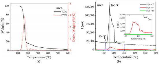 (a) TGA and (b) MS multiple ion detection curves for pure urea.