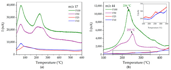 For the functionalized compounds, the general trend indicates that m/z 17 and 44 signals increase according to the degree of functionalization, being noticeable in F50 and F100, but negligible in F10 and F25. As for m/z 17 (see Figure 6a), it is possible to observe in all cases a band below 100 °C, which is attributed to the HO+ species coming from hydration water molecules. In contrast, the band located in the 200–260 °C range can be attributed to the NH3+ fragment of urea, which appears at a higher temperature than in pure urea (134–210 °C), evidencing a confinement effect for the framework pore. On the other hand, m/z 44 (see Figure 6b) presents maxima in its signals at 255 °C and 234 °C for F50 and F100, respectively, while in the samples with lower degrees of functionalization, only small signals can be observed around 250–275 °C. It is interesting to note that both signals (m/z 17 and 44) occur at higher temperatures than the corresponding ones in pure urea, which can be explained in terms of the existence of an interaction between this species and the MOF pore walls.