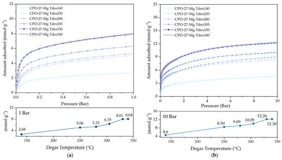 CO2 adsorption isotherms at 25 °C for CPO-27-Mg degassed between 140 and 340 °C are displayed in Figure 7. The adsorption capacities of CPO-27-Mg reached values of 2.7 and 8 mmol g−1 at 1 bar (Figure 7a) and 4.6 and 12.4 mmol g−1 at 10 bar (Figure 7b), respectively. The yields at different pressures showed an increasing trend as the degassing temperature increased; the compound CPO-27-Mg degassed at 330 °C (CPO-27-Mg Tdegas330) exhibited the best CO2 adsorption capacity of 8 mmol g−1 at 1 bar and 12.4 mmol g−1 at 10 bar, increasing up to 170% when compared to CPO-27-Mg degassed at 140 °C (CPO-27-Mg Tdegas140). The adsorption capacity of the degassed compound at 340 °C was the same as that degassed at 330 °C.