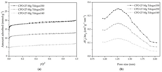 The effect on the textural properties of the samples under different degassing temperatures was analyzed using N2 adsorption–desorption isotherms at −196 °C. The degassed CPO-27-Mg compounds at 140, 250, and 330 °C were selected, and their corresponding adsorption–desorption N2 isotherms are displayed in Figure 8a. According to IUPAC classification, all samples present an isotherm Type I(b) at low relative pressure, with an H4 hysteresis loop, characteristic of microporous materials having supermicropores [26]. Finally, the adsorption–desorption isotherms of N2 show the same trend as CO2, i.e., increasing in adsorbed quantity as the degassing temperature increases.