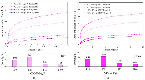 CO2 adsorption at 25 °C of CPO-27-Mg compounds up to (a) 1 bar and (b) 10 bar of pressure.