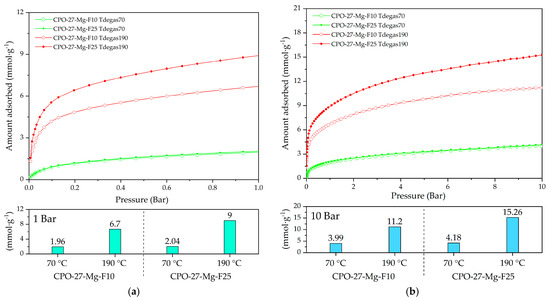 CO2 adsorption at 25 °C of CPO-27-Mg-F10 and CPO-27-Mg-F25 degassed at 70 and 140 °C up to (a) 1 bar and (b) 10 bar of pressure.